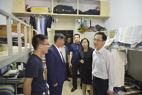 检查组深入A区留学生公寓餐厅、新图书馆、阳光讲坛及部分教学楼、寝室楼等地,查看校园公共场所、教室、食堂、寝室的卫生情况,并现场办公,对一些墙体老化渗水、瓷砖脱落、地面铺设等问题共同商讨,明确责任,落实解决方案。