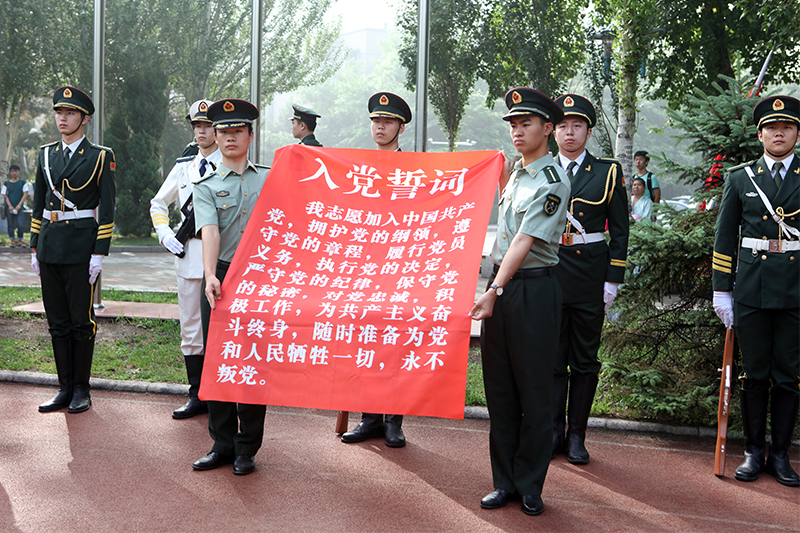 升旗礼毕,在学校党委组织部领誓人的带领下,参加升旗仪式的全体党员面向党旗庄严宣誓。“我志愿加入中国共产党,拥护党的纲领,遵守党的章程......”高举的拳头、鲜红的党旗映衬着每一张激动的脸庞,一字一句、句句入心的入党誓词表达了师生们对共产主义理想信念的执着追求。随后,学生军乐团鼓号响起,全体人员在国旗下饱含深情地合唱《歌唱祖国》,表达对党对祖国的祝福与热爱,“越过高山,越过平原,跨过奔腾的黄河长江……英雄的人民站起来了,我们团结友爱坚强如钢!”嘹亮的歌声唤起中华儿女的自豪和向往,铿锵的旋律奏响实现中国梦的伟大乐章。