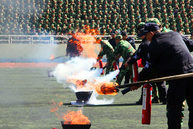 消防战士为演练学生演示灭火器材的使用及逃生方法,参加演练学生开始进行灭火、逃生演练。
