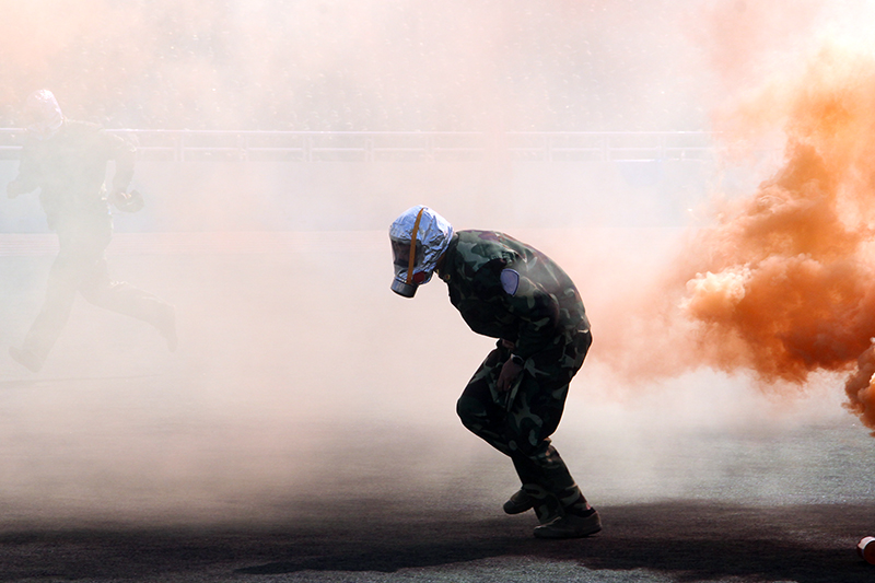 市公安消防支队南岗大队王毅参谋为军训学生进行消防安全知识培训,就如何佩戴呼吸面具、如何使用灭火器、如何进行灭火逃生等进行了讲解。