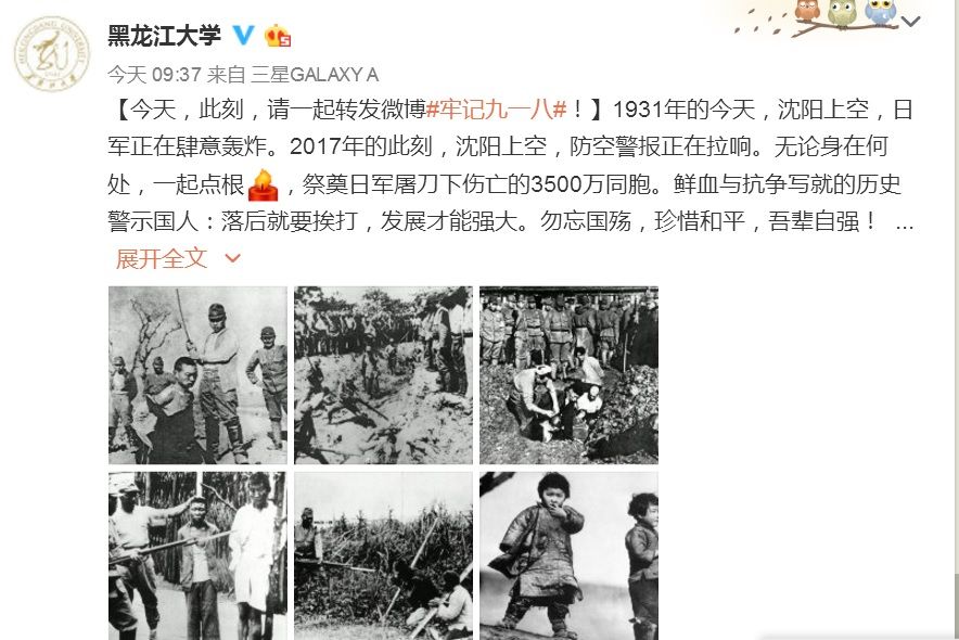 9月18日上午,sunbet申搏官方微博参与#牢记九一八#话题,发布微博推送,祭奠日军屠刀下伤亡的3500万同胞。勿忘国殇,珍惜和平,吾辈自强!