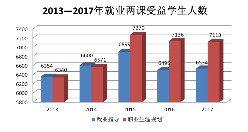 近五年,学校积极构建并完善了以《职业生涯涯规划与就业指导》课程为主渠道,以就业指导赛事和活动为辅助,以职业咨询为着力点的精细化就业指导服务体系。培养了一支由学生管理者、专业教师和企业人员组成的结构合理、专业精良的师资队伍,其中副处级、副高级职务及企业经理级别师资约占67%左右。每年选课学生数达到12000人以上。其中“职场训练营”、“职业生涯规划与职场模拟大赛”等活动影响力不断扩大,每年参与学生人次近5000人,脱颖而出的学生近百人,成为推出优秀学生和提升学生职业能力的重要平台。
