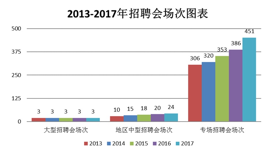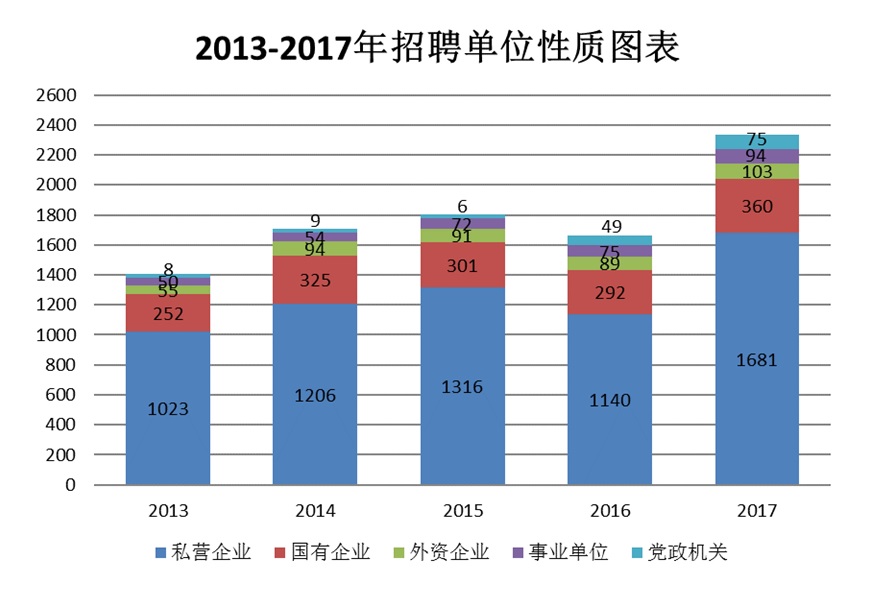 近五年学校通过“走出去,请进来”积极开拓省内外就业市场,以“优质服务和优秀的毕业生质量”创出sunbet申搏官方网站品牌,彰显学校影响力。市场区域分布结构更科学,地区覆盖珠三角经济区、长三角经济区、长江经济带、渤海湾京津冀经济区、沿海开放城市,尤其江苏省、浙江省各区市,连续12年到校招聘。招聘会层次更多元,学校每年精心组织召开大型、中型、专场、行业和校友招聘会,年招聘会场次达470余场。招聘岗位更充足,从2013年的年招聘岗位24658增长到2017年35867,供需比达1:4。招聘单位质量更优质,招聘单位国企占比由2013年的252家增长为2017年360家,民营企业从1 023家增长到1681家。知名企如碧桂园、58同城、中粮集团、IBM、亨通集团、恒大集团、格力电器、哈飞集团、哈空调集团和朝阳企业如深圳卓越物业、大连金玛集团等逐年增多。