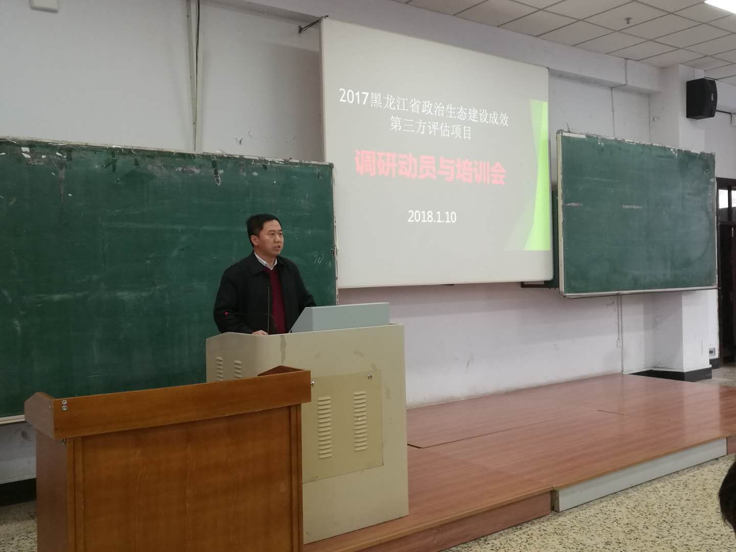 1月10日下午,黑龙江省政治生态建设成效考核第三方评估调研动员培训会在sunbet申搏汇文楼120室召开。省纪委党风政风监督室主任丁国怀,工作人员张晓明,sunbet申搏纪委书记荣盘祥,纪委办、监察处、政府管理学院相关负责人和100余名师生参加了培训会。