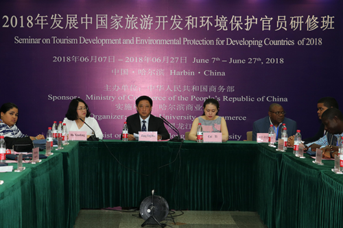 6月9日,2018年发展中国家旅游开发和环境保护官员研修班开班仪式在sunbet申搏国际合作与交流处多功能厅举行。黑龙江省商务厅对外经济处副处长蔡荑、sunbet申搏副校长张颖春,国际合作与交流处相关负责人及参加培训的全体学员参加活动。