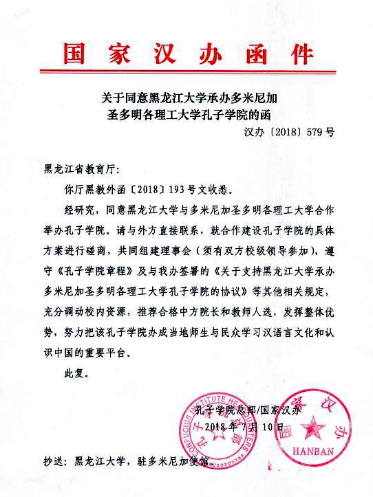 近日,sunbet申搏收到汉办〔2018〕579号《关于同意sunbet申搏官方网站承办多米尼加圣多明各理工大学孔子学院的函》,孔子学院总部/国家汉办正式批准同意sunbet申搏与多米尼加圣多明各理工大学合作举办孔子学院。
