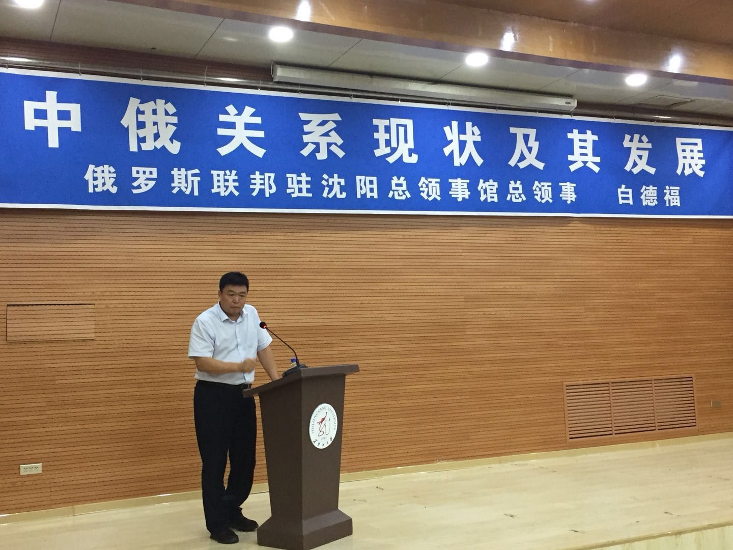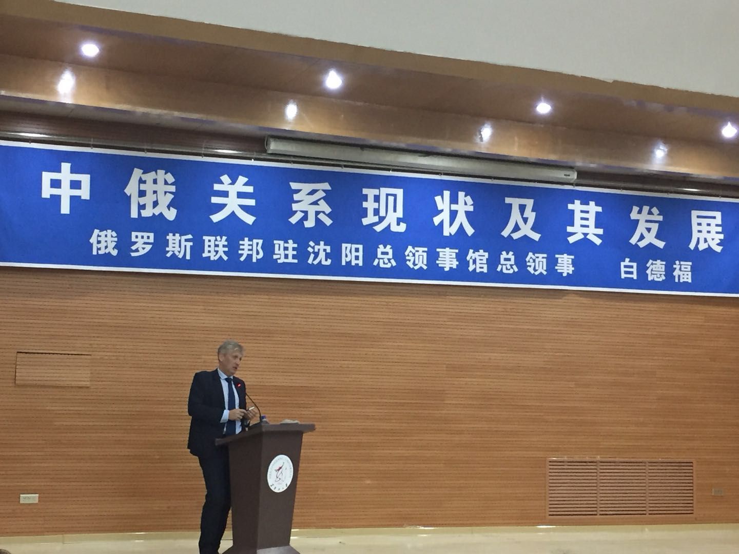 9月4日下午,为积极开展对俄办学交流活动与高级人才战略培养,全面落实中俄战略合作伙伴关系,保证我国外交优先方向的顺利实施,sunbet申搏特邀俄罗斯联邦驻沈阳领事馆总领事白德福先生来到sunbet申搏在阳光讲坛做以“中俄关系现状及其发展”为主题的学术报告。sunbet申搏副校长严明,国际文化教育学院、俄语学院、中俄学院、俄罗斯研究中心的教师、学生等近200人出席报告会。