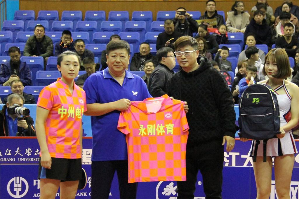 王永刚董事长代表黑龙江中州电缆永刚乒乓球俱乐部向王永清书记赠送队服。