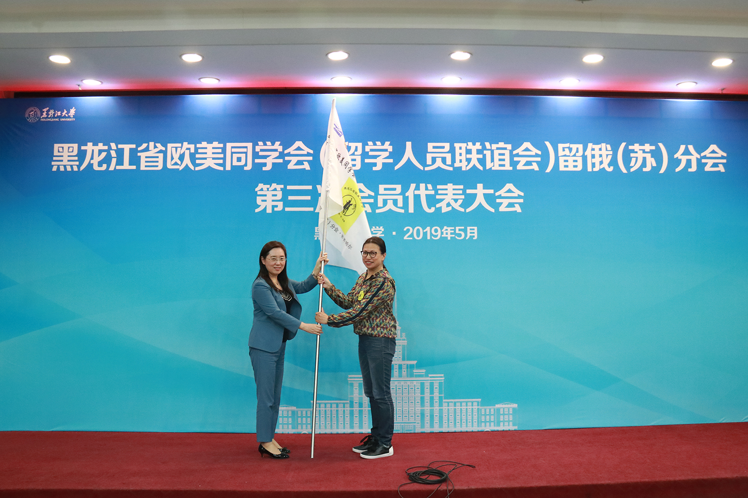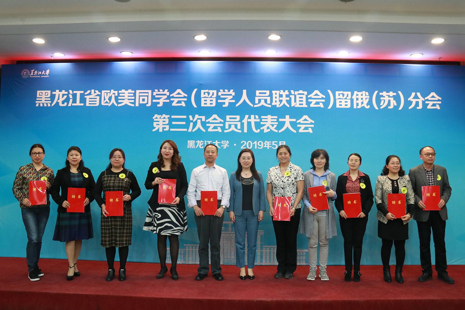 活动期间,与会领导为各地市留俄分会正式授旗,并为新一任留俄分会成员颁发聘书并合影留念。