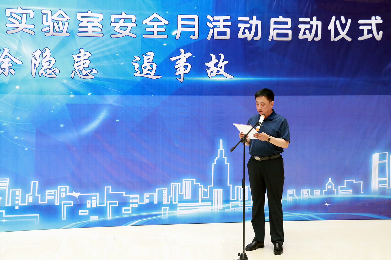 付宏刚校长在启动仪式上致辞,他指出开展实验室安全月活动,既是落实上级有关要求、狠抓实验室安全宣传教育培训的有力举措,更是激励广大师生自觉提高安全素养的生动实践。当前,随着学校双一流建设的稳步推进,实验室规模逐步扩大,安全管理面临的风险和挑战也愈发增多,这更需要我们团结一致、凝心聚力、齐抓共管,打好实验室安全主动仗,为维护学校安全稳定大局,实现强校发展目标作出应有的贡献。付校长就抓好实验室安全提出了三点希望:一是希望大家常怀忧患想安全。要多想一想实验室会不会出问题,哪里会出问题,怎样防止出问题。筑牢底线,不触红线,不断推动实验室建设安全发展、稳步发展。二是希望大家以人为本抓安全。要强化人的安全意识,突出实验指导老师这个重点。三是希望大家落实制度保安全。要自觉学习法规要求、落实规章制度、严格规范操作。切实用制度消除隐患苗头,堵塞安全漏洞、守住安全底线。
