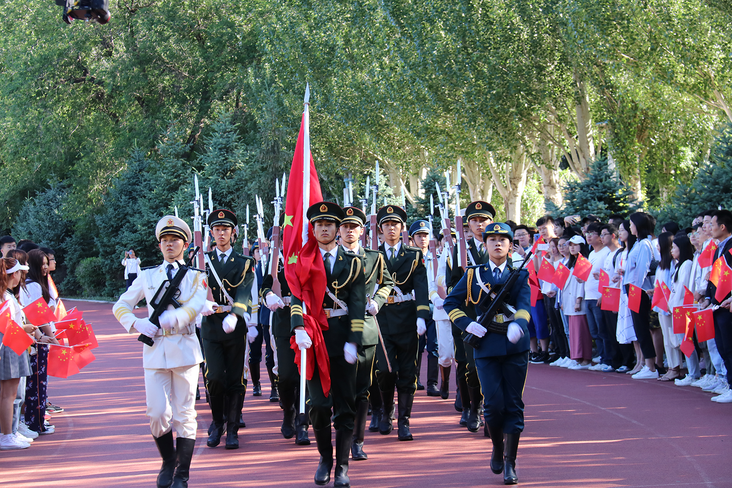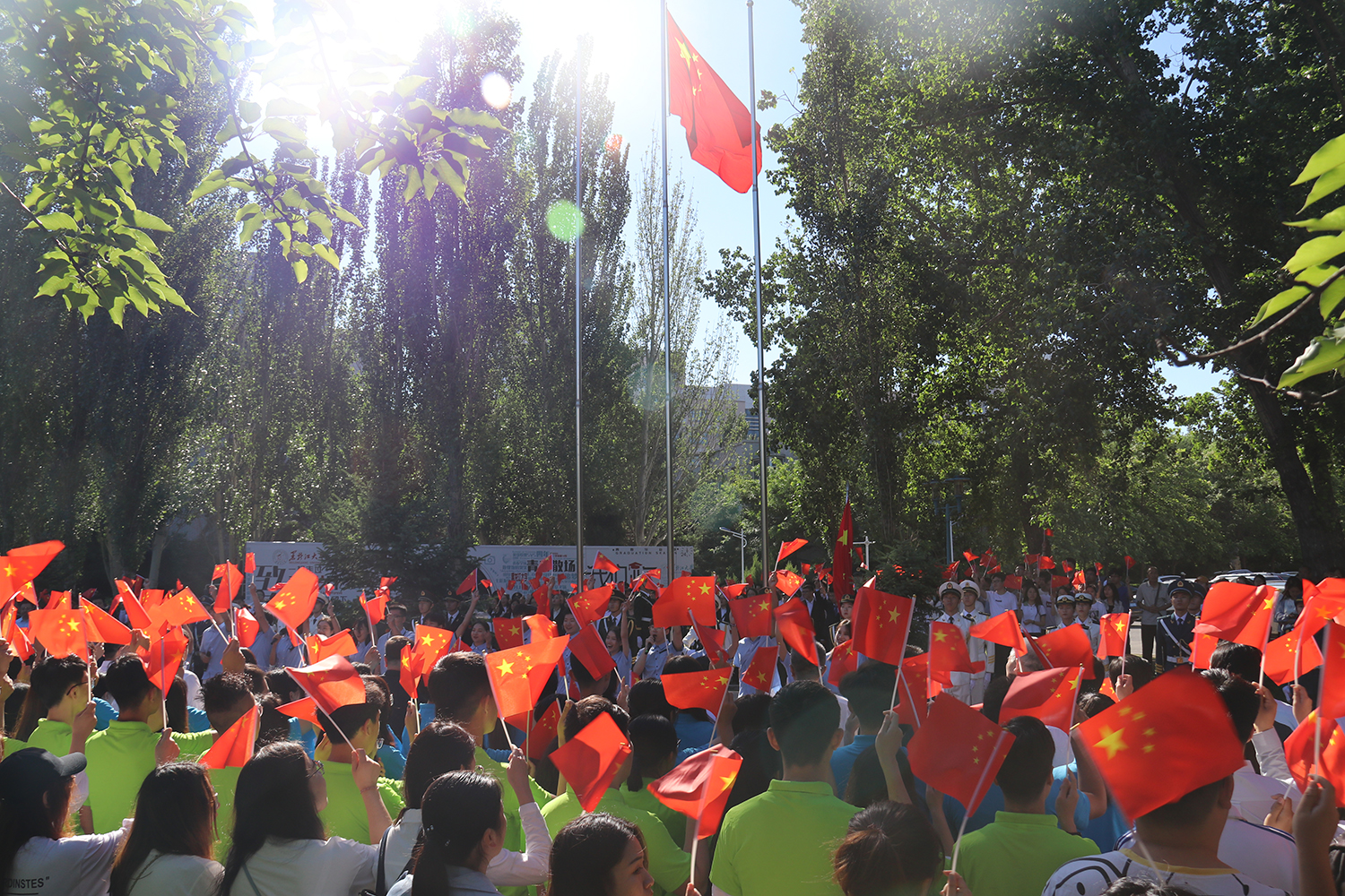 在《红旗颂》的音乐声中,校国旗缓缓入场,庄严地升起五星红旗。“起来! 起来! 起来! 我们万众一心, 冒着敌人的炮火,前进”,师生们高唱国歌,在歌声中深情回顾祖国一路走来的光辉历程。