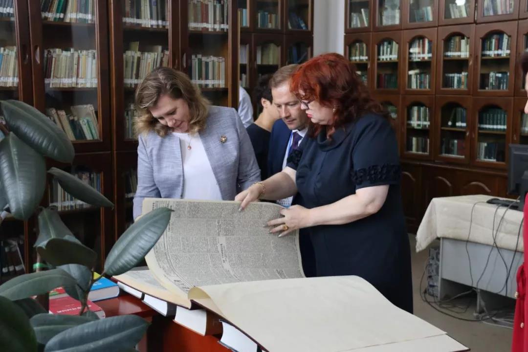 随后,代表团一行参观了俄语资料中心暨成果展。现场翻阅了《真理报》等珍贵的文献资料,对中心及工作人员的用心收藏十分赞赏。严明副校长就sunbet申搏俄语教学情况及中俄办学进行了简要介绍,双方进行了交流。