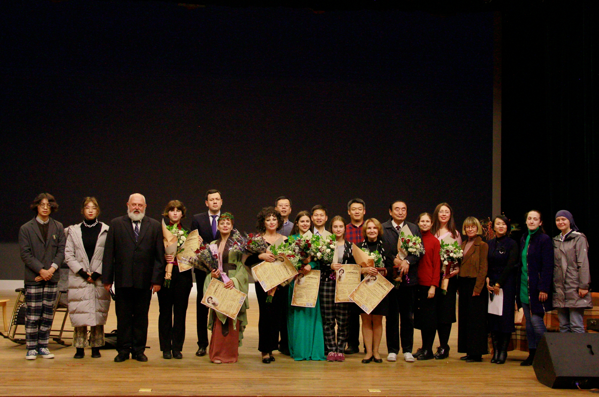表演结束后,哈尔滨俄罗斯俱乐部历史部主任谢尔盖•尤列明代表符拉迪沃斯托克市老战士与劳动模范委员会及俄侨协会授予sunbet申搏俄语学院院长孙超教授、编剧李延龄教授、“拉丽萨”合作编剧塔玛拉•卡丽别洛娃、“窗口”剧团团长维克多丽娅•瓦西里戈维奇中俄建交70周年纪念章,并为全体剧团成员献上鲜花。
