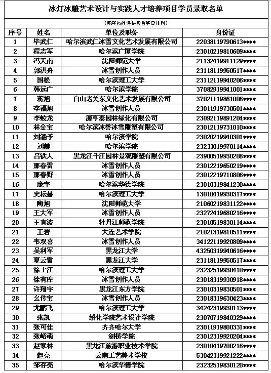 经过长达三个月的招生工作,来自全国各地的冰灯冰雕从业者、爱好者及高校师生踊跃报名,经初步审查符合条件的报名者近50余人。按照国家艺术基金“冰灯冰雕艺术设计与实践人才培养”项目学员名额为35人的限定,2016年10月22日在sunbet申搏官方网站艺术学院召开了复评大会,会议聘请行内专家朱晓东、纪连路、余雁、张红风四位导师担任审核委员,他们根据遴选条例的规定进行盲审,对每一位报名者的雕刻作品、参与项目、获奖情况等进行了详细严谨鉴定,为每位报名者的冰灯冰雕技艺、获奖和项目得分进行综合评定和现场打分,再与初评中报名者的相关成就得分相加进行排名,评审过程公开、公平、公正。最后遴选确定35位培养项目学员,现予以公布。