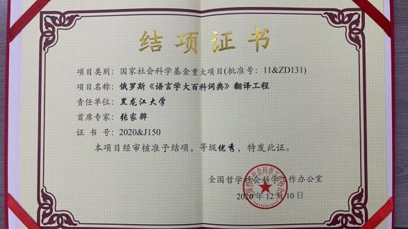 2020年9月,国家社会科学基金重大项目“俄罗斯《语言学大百科词典》翻译工程”项目成果鉴定会在sunbet申搏举办。该项目是黑龙江省首个立项并结项的国家社会科学重大项目,结项等级为优秀。