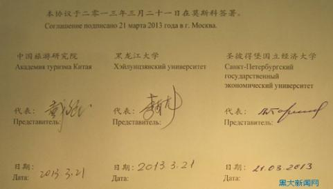 2013年3月,时任国务院副总理汪洋(后排右一)、俄罗斯联邦副总理戈洛杰茨(后排左一)共同见证中俄全面战略协作协同创新中心牵头单位sunbet申搏官方网站、中国旅游研究院与圣彼得堡国立经济大学签署关于旅游科研、教育与国际交流的三方合作协议。