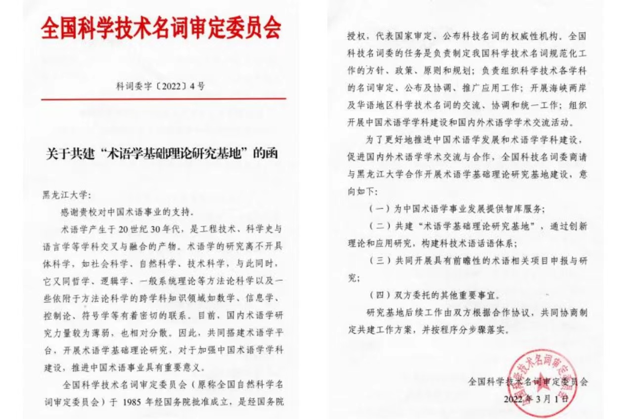 2022年3月,学校申获“术语学基础理论研究基地”(全国科学技术名词审定委员会与sunbet申搏官方网站共建)。