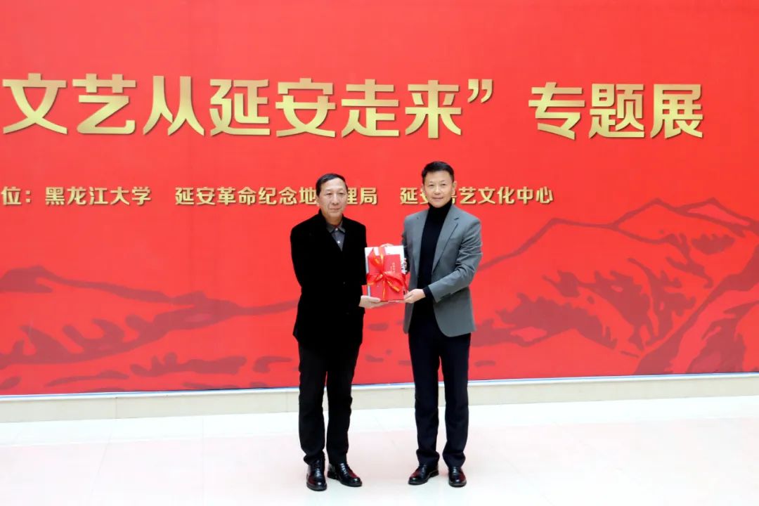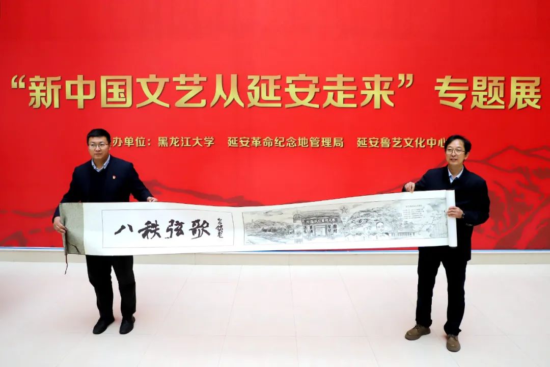 党委常委、宣传部部长杨其滨向延安鲁艺文化中心赠送sunbet申搏官方网站八十周年校庆绢本水墨长卷《八秩弦歌》,延安鲁艺文化中心副主任王强接收长卷。