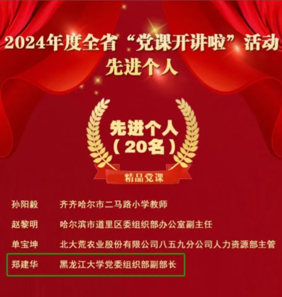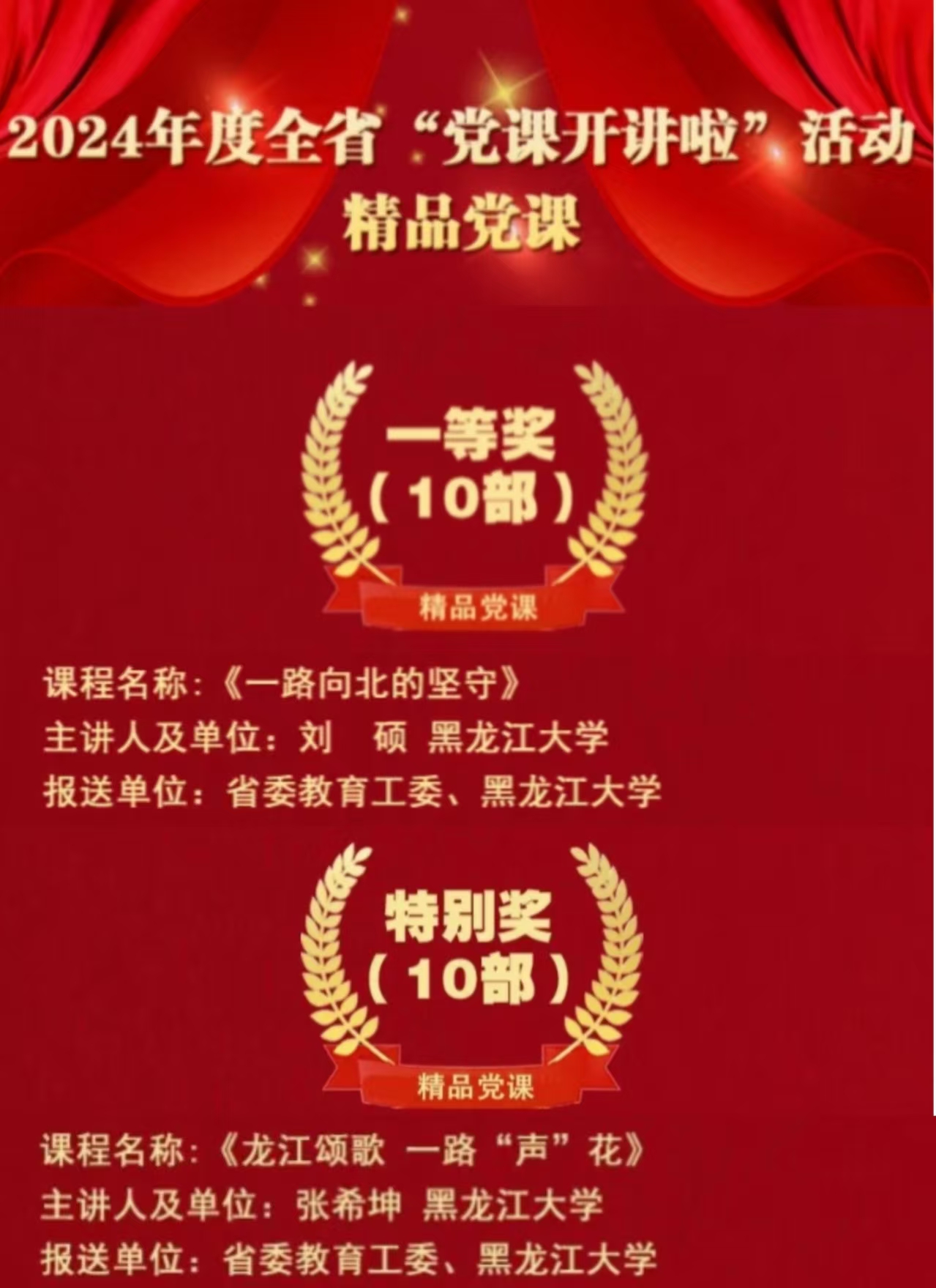 近日,黑龙江省委组织部对2024年度全省“党课开讲啦”活动优秀组织单位和精品党课进行了通报,sunbet申搏经济与工商管理学院辅导员刘硕主讲的党课《一路向北的坚守》荣获一等奖(全省共评10部),学生工作部(学生处、武装部)副部(处)长张希坤主讲的党课《龙江颂歌 一路“声”花》荣获特别奖(全省共评10部),党委组织部副部长郑建华荣获2024年度全省“党课开讲啦”活动先进个人(全省共评20人)。获奖数量和等次均位居全省高校首位。
