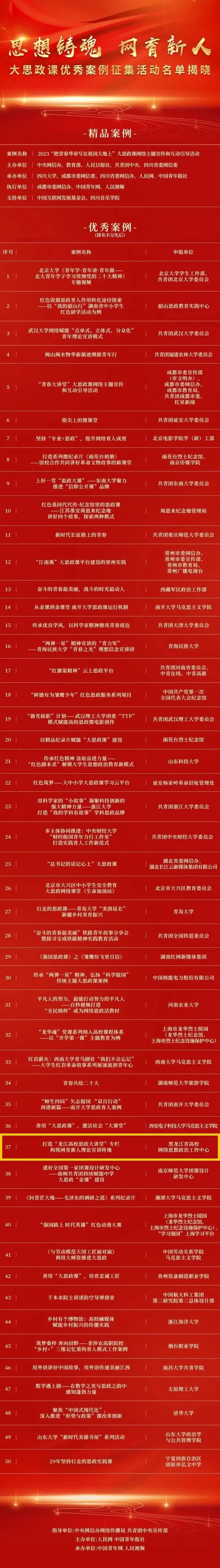 近日,由中央网信办网络传播局、共青团中央宣传部指导,人民网、中国青年报社共同主办的“思想铸魂 网育新人”大思政课优秀案例征集活动评选结果揭晓,经初选、终选以及结果公示,产生精品案例1件、优秀案例50件。黑龙江省高校网络思想政治工作中心(sunbet申搏官方网站)申报的《打造“龙江高校思政大讲堂”专栏 构筑网育新人理论宣讲阵地》获评优秀案例,是黑龙江省唯一入选的大思政课优秀案例。