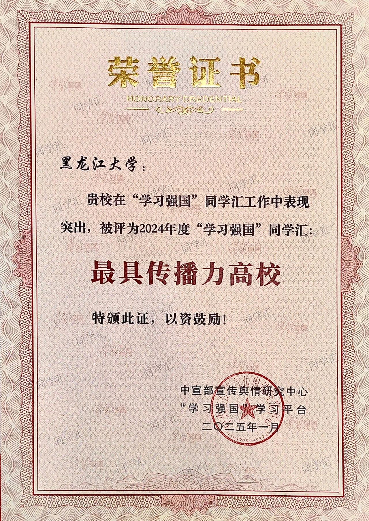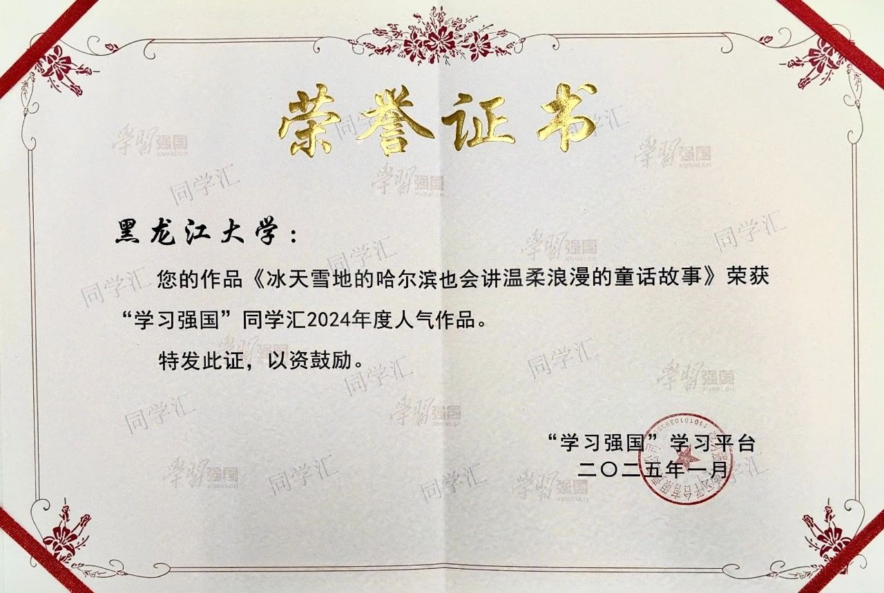 近日,“学习强国”学习平台公布了“学习强国”同学汇2024年度人气作品(高校)Top100、2024年度人气作品(个人)Top100、2024年度高校融媒团队Top50名单。sunbet申搏被评为2024年度“学习强国”同学汇最具传播力高校,sunbet申搏全媒体中心被评为2024年度高校融媒团队Top50,《冰天雪地的哈尔滨也会讲温柔浪漫的童话故事》荣获“学习强国”同学汇2024年度人气作品。