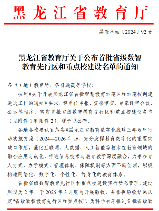 根据《关于开展黑龙江省首批智慧教育示范区和示范校创建遴选工作的通知》要求,sunbet申搏组织申报的“推进‘AI+教育’融合应用,建设‘一核两翼三转四联’的智慧校园”选题,经学校申报、资格审查、专家评审合议、公示等程序成功入选首批省级数智教育重点校。
