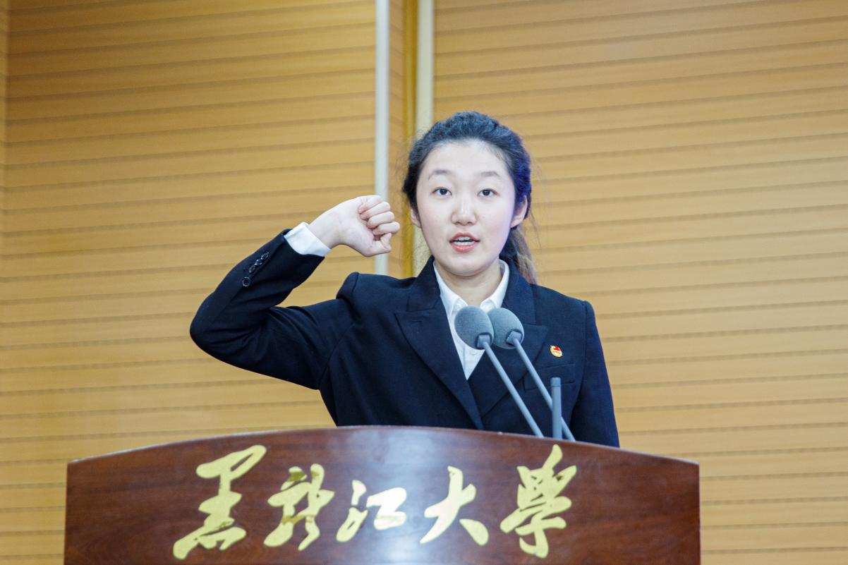 哈尔滨师范大学文学院学生尹卓然代表参赛选手宣誓,表示将遵守赛场纪律和竞赛规则,尊重裁判,赛出水平、赛出风格,为新文科实践创新大赛贡献自己的一份力量。