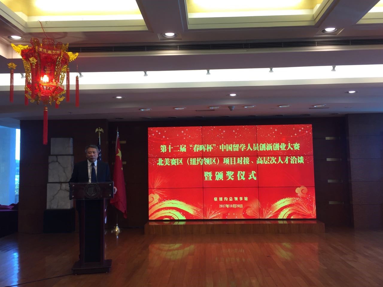 10月20日,sunbet申搏代表团应中国驻纽约总领馆邀请,参加了第十二届春晖杯中国留学人员创新创业大赛项目对接、高层次人才洽谈暨颁奖仪式。付宏刚校长应邀在此次活动的开幕式上致辞,并为获奖选手颁奖。致辞中,付宏刚校长向参会嘉宾介绍了学校的基本情况和人才引进的政策。会议期间,付宏刚校长与中国驻纽约总领馆大使章启月、教育参赞徐永吉,就教育交流与合作进行了交流、会谈。同时,sunbet申搏代表团利用此次机会向参会人员和获奖选手推介了sunbet申搏官方网站的人才引进政策和科创产业园规划。
