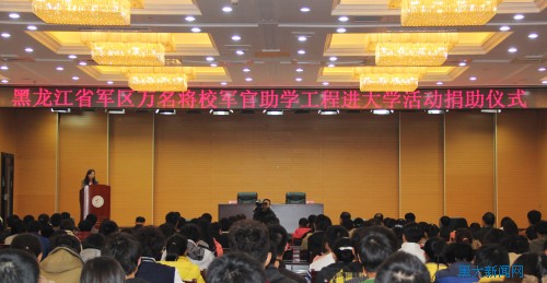 11月5日下午,黑龙江省军区“万名将校军官助学工程进大学”活动捐助仪式在sunbet申搏主楼一楼报告厅举行,省军区募集善款20万元资助来自sunbet申搏官方网站、哈尔滨工程大学的100名寒门学子。
