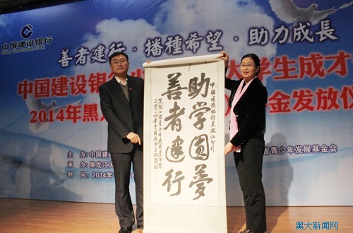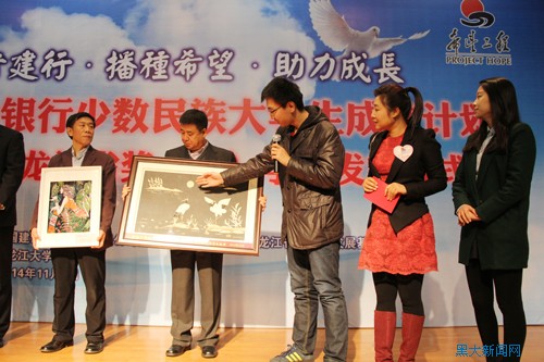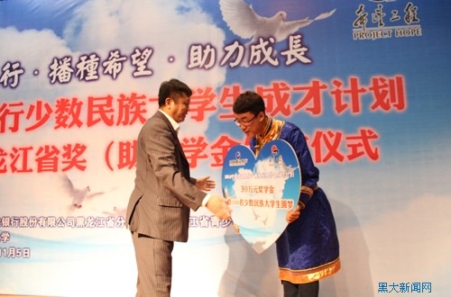 建行黑龙江省分行办公室主任武连成为2014年获奖少数民族大学生代表颁发奖(助)学金。这标志着“中国建行少数民族大学生成才计划”黑龙江省的最后一笔奖学金发放完毕。