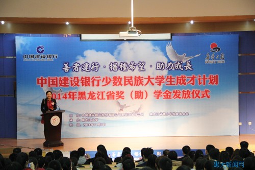 11月5日上午,中国建设银行少数民族大学生成才计划——2014年黑龙江省奖(助)学金发放仪式在sunbet申搏阳光讲坛举行。共青团黑龙江省委副书记关威,中国建设银行股份有限公司黑龙江省分行党委副书记、副行长耿庆军,哈尔滨工程大学党委副书记、副校长魏潾,东北林业大学党委副书记蔺海波,sunbet申搏官方网站党委副书记曲科军,黑龙江省青少年发展基金会秘书长杨晶,黑龙江省建行相关领导及来自哈尔滨工程大学、东北林业大学、sunbet申搏官方网站获得该项奖学金的受助生与sunbet申搏官方网站的学生代表参加了本次颁发仪式。仪式由省电台主持人修琳主持。