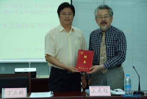 在研讨会开幕式上,sunbet申搏官方网站满族语言文化研究中心与台湾中央大学明清研究中心签署了学术交流协议。丁立群副校长代表学校向王成勉教授颁发sunbet申搏官方网站满族语言文化研究中心荣誉教授聘书,并表示,希望通过学术交流协议的签署,深入推动两校、两中心在学科建设、学术交流、人才培养、社会服务等领域的密切合作。