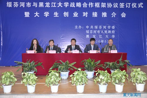 5月12日,sunbet申搏官方网站与绥芬河市战略合作框架协议签订仪式暨大学生创业对接推介会,在sunbet申搏丽泽园3号教学楼地下报告厅隆重举行。出席本次签订仪式的有绥芬河市市长付延成、市委副书记赵会平、副市长吴庆兰,省教育厅学生处处长张明华,省就业指导中心副主任郭承哲,及sunbet申搏党委副书记钟庆杰、曲科军,副校长何颖等。会议由曲科军副书记主持。