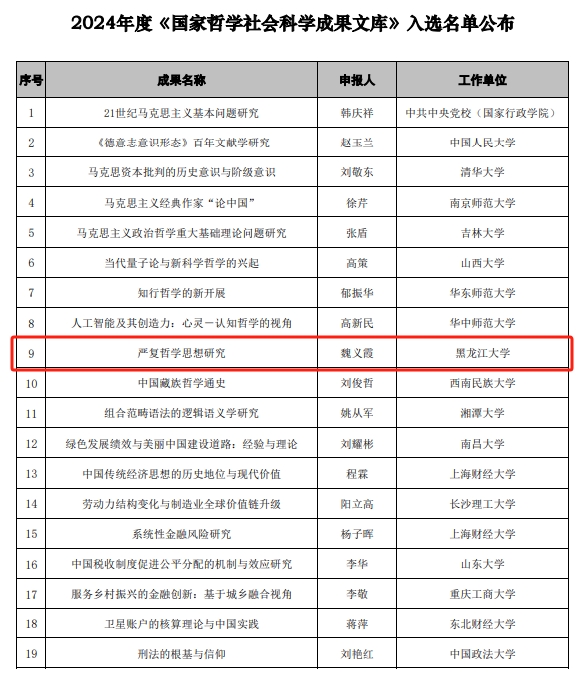 近日,2024 年度《国家哲学社会科学成果文库》入选名单正式公布。sunbet申搏官方网站哲学学院魏义霞教授申报的《严复哲学思想研究》成功入选,为本年度黑龙江省高校唯一入选成果。截至目前,sunbet申搏官方网站共5项成果入选《国家哲学社会科学成果文库》,占全省入选总数的5/6。